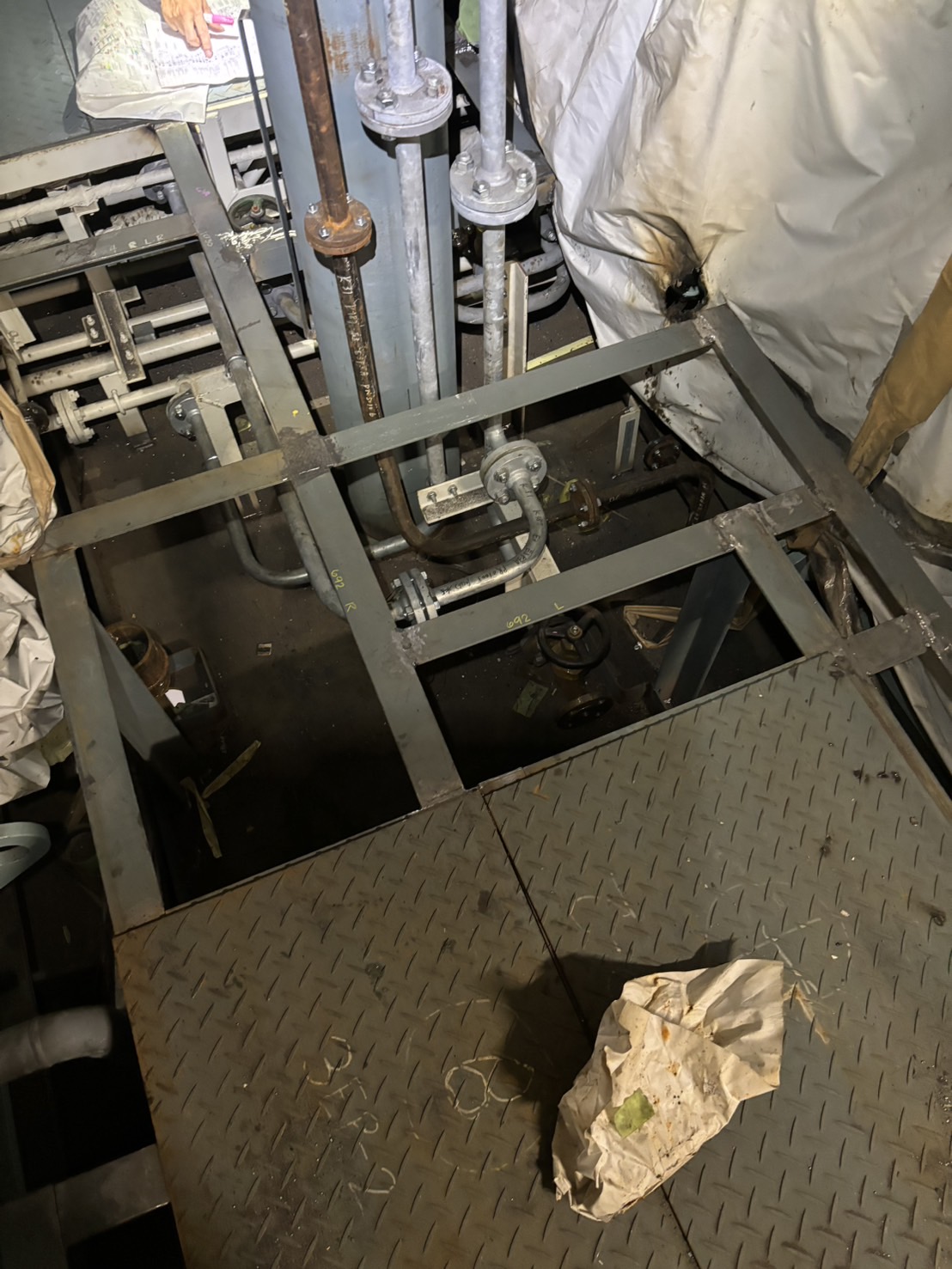 製作した鋼材を船内へ搬入し、現場にて歩廊の取付工事を実施しました。 限られたスペースでの作業となりましたが、安全管理を徹底。 溶接・調整を行い、エンジン周りを囲う歩廊を精度良く設置。 船内作業特有の環境にも対応し、無事に施工を完了しました。